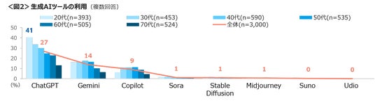 利用している生成AIのツールは「ChatGPT」27%、「Gemini」14%、「Copilot」9%の3つに集中、それ以外のツールの利用は極めて少ない。「ChatGPT」の利用率は、20~40代までが高く、特に20代は41%に達する。<図2>