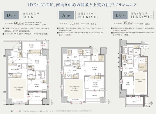 間取りは、1DK~3LDK(25m2台~60m2台)の全12タイプとし、空間を効率的に生かし、居住性を高めた住空間を目指しました。開放性、収納力といった住まいの心地よさを重視しつつ、先進設備・仕様を行き届かせた、品質感のあるプランを実現しています。