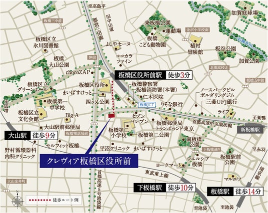 本物件は、都営三田線「板橋区役所前」駅のほか、東武東上線「大山」駅、「下板橋」駅、JR埼京線「板橋」駅の4駅3路線が利用可能です。ビッグターミナルの「池袋」駅へ14分、池袋を生活圏とする好立地に誕生します。都営地下鉄三田線は、大手町駅へ直通17分、日比谷駅へ直通19分など、都心各地への直通アクセスに加え、他路線に乗り換えできる駅が多く、都心主要駅へスムーズなアクセスが可能です。