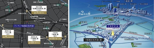 「クレヴィア板橋区役所前」は、都営三田線「板橋区役所前」駅徒歩3分、4駅3路線が利用可能で、「池袋」駅へ14分、「大手町」駅へ直通17分と、都心へのアクセスが良好な立地です。現地から池袋駅までは、自転車で9分という距離にあり、池袋駅周辺の賑わいを身近にしながら、落ち着いた住環境を享受できるポジションです。