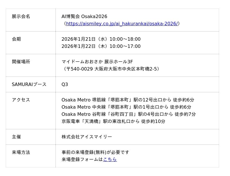企業のDX支援およびIT教育を展開する株式会社SAMURAI(本社:東京都港区、代表取締役:羽田 吾立)は、2026年1月21日(水)・22日(木)にマイドームおおさかで開催される展示会「AI博覧会 Osaka2026」に出展いたします。