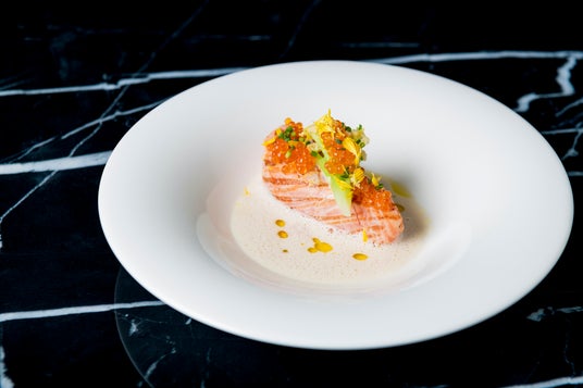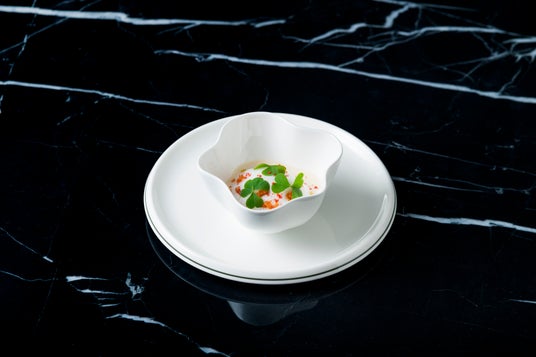 グリエの焼き色を付けたサーモンのミキュイに、旬のカリフローレ、マスの卵、シブレットを美しくあわせました。ヴェルヴェーヌのソースで仕上げることで、クリーミーな舌触りの中に爽やかな後味が広がる、上質で洗練された味わいの一皿です。