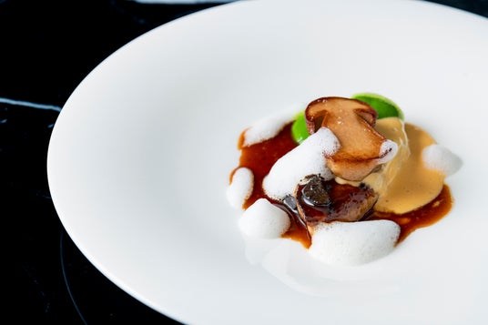 香ばしくポワレしたフォアグラにセップ茸のコンフィを添え、セルバチコのほろ苦さ、ウフ・ブイエ(フランス風のスクランブルエッグ)のまろやかさ、トリュフの芳醇な香りが楽しめる3種のソースで多彩な味わいを表現しました。3種のソースが重なり合うことで、奥行きのある特別な一皿に仕上げています。