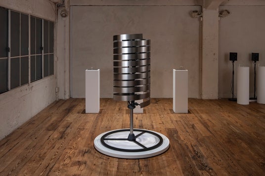 本作は機械式腕時計のぜんまいから着想を得た作品です。薄い金属が巻かれたその形は、単なる機構部品にとどまらず、時を駆動する力とリズムを宿す器のように思えました。そっと持ち上げるとわずかな動きを受け取り、今にも鼓動を始めるかのように揺れ動いたのです。 伸縮するアームに支えられた一枚の金属板は刻一刻と形を変え、新たな秩序を生み出し続けます。移ろう螺旋の姿は、目に見えぬ時間の輪郭を静かに描き出しています。