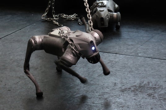 鎖に繋がれたロボット犬が、人に襲いかかろうと暴れ狂う姿を、安全圏から眺める作品です。