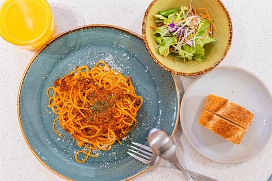 見学のあとは、lyf crewも一緒に、lyf銀座東京内のカフェ「Refuel+」でヘルシーサラダ付きパスタランチセットを囲んでチルアウト。ローカルを感じ、世界が交わる。そんな感度の高い東京の朝を目いっぱい楽しむことができます。