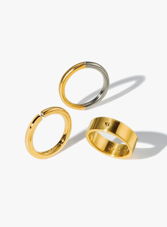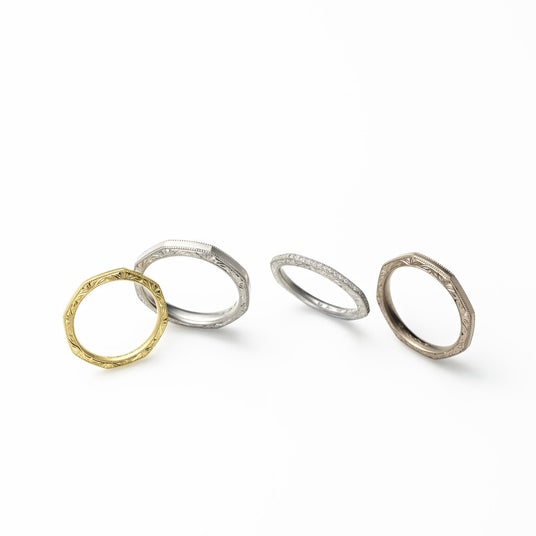 (左から)OCTAGON RING K18/¥224,400~(tax in) OCTAGON RING プラチナ950×ホワイトダイヤ/¥383,900~(tax in)OCTAGON RING K18ホワイトゴールド/¥304,700~(tax in)