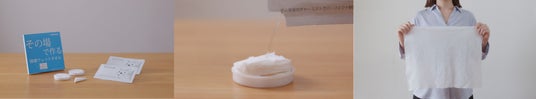個包装の除菌液と圧縮タオルを使用し、使う直前に“その場で”除菌ウェットタオルを作る新しい衛生アイテムで、除菌液が乾燥しないため長期備蓄に最適です。