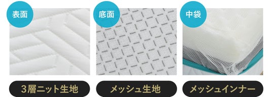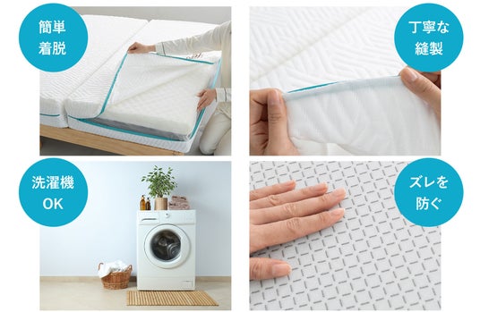 アウターカバーと中材の摩擦を軽減するメッシュインナーと大きく開くコの字ファスナーで、着脱が簡単。また、ファスナー裏の丁寧な縫製により、美しい見た目とアウターカバーの耐久性を実現。アウターカバーはご家庭の洗濯機で洗えるため、いつでも清潔にお使いいただけます。さらに底面の滑り止めが、睡眠中の寝返り等によるマットレスのズレを防ぎます。