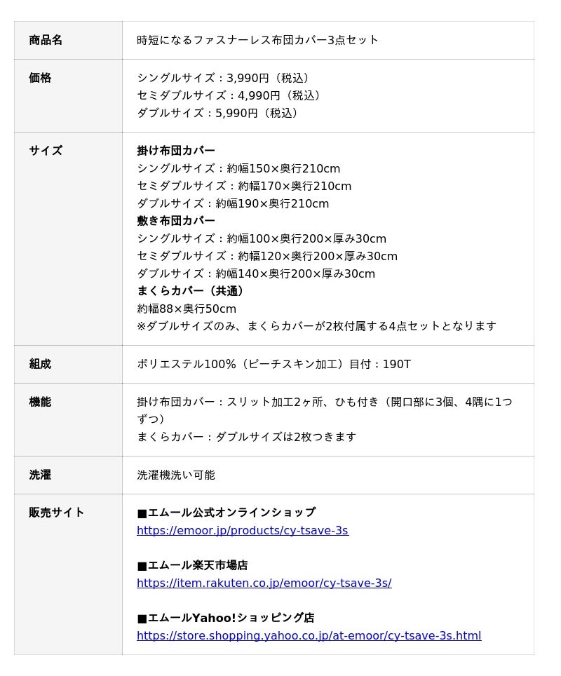 「身体に合った寝る・座る・たたむ」を提供する健康家具ブランドEMOORを展開する株式会社エムール(東京都立川市:代表取締役 高橋 幸司/以下エムール)は、2026年2月11日より『時短になるファスナーレス布団カバー3点セット(以下、本商品)』の販売を開始しました。本商品は、シングルサイズ用・セミダブルサイズ用・ダブルサイズ用の3サイズ展開です。