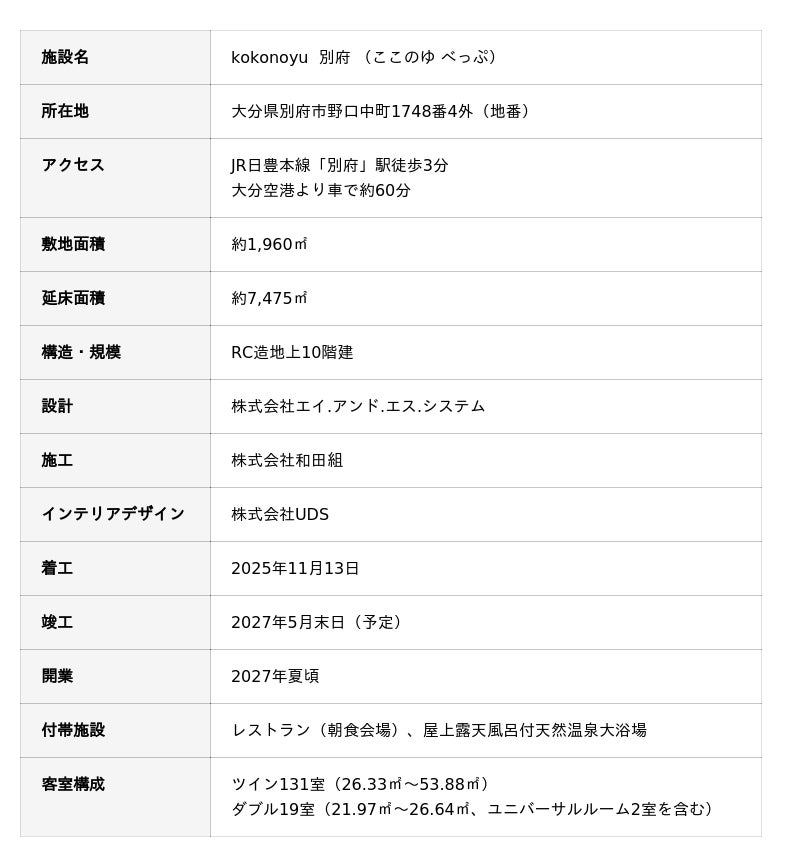 本ホテルは、別府エリアの更なる観光活性化に貢献すべく、これまで宿泊施設の供給が限定的であった別府駅西口至近に開発します。最上階には日本随一の泉質を誇る別府温泉の大浴場を備え、露天風呂からは別府タワーが一望できます。2階には朝食を提供するレストランを備え、「kokonoyu」ブランドを象徴する現代的ながら日本らしさを感じられる空間の中で、国内外の幅広い層のお客様に別府のおもてなし文化を発信します。本ホテル概要