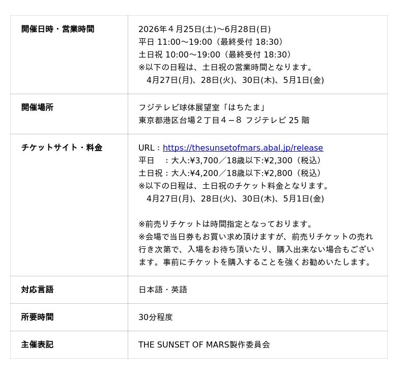 この度、未来の火星旅行をVRで体験できる次世代型イベント『 THE SUNSET OF MARS(サンセットオブマーズ)』の開催が決定いたしました。 4月25日(土)から6月28日(日)の期間限定で、東京・お台場 フジテレビ球体展望室「はちたま」 (東京都港区台場2丁目4−8 フジテレビ 25 階)にて実施いたします。