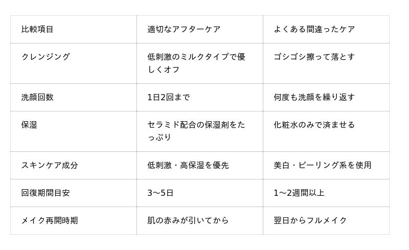 多くの方が1週間以内に回復している一方、2週間以上かかった方も約1割存在します。回復期間の長さは、アフターケアの質や元々の肌状態に大きく左右されると考えられます。