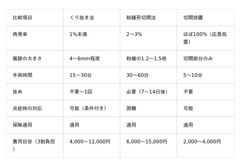 粉瘤の手術法比較(くり抜き法 vs 紡錘形切開法 vs 切開排膿)