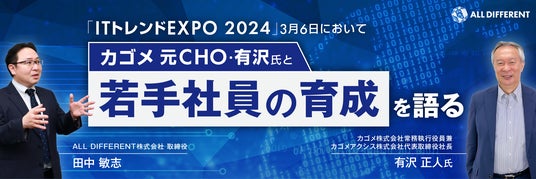 累計13,000社400万人以上の組織開発・人材育成を支援するALL DIFFERENT(オールディファレント)株式会社(旧株式会社ラーニングエージェンシー 所在地:東京都千代田区 代表取締役社長:眞崎大輔)は2024年3月5~8日に開催されるオンラインイベント「ITトレンドEXPO 2024」に登壇します。「どう接する?! 有沢氏と考える若手の早期活躍・自立自走のためにすべきことについて」と題し、カゴメの人事改革をけん引し、著書も話題の有沢正人氏(カゴメ株式会社常務執行役員 兼 カゴメアクシス株式会社代表取締役社長)と、当社取締役の田中敏志が6日、対談形式で若手社員の育成課題について語り合います。