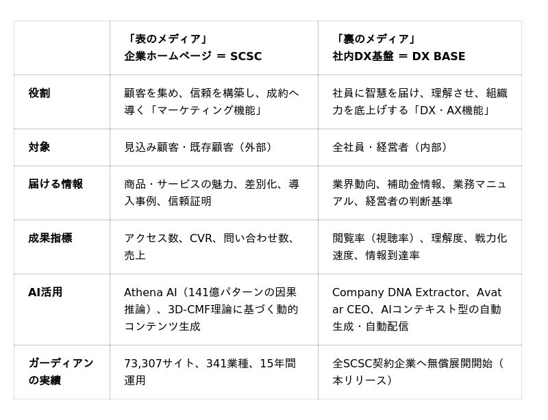 無償提供には明確な戦略的意図があります。「表のメディア」で守り続けてきた73,307社のクライアント企業を、「裏のメディア」でさらに深く支援する。企業がDX BASEに蓄積する独自ナレッジDB、AI学習済みの経営者判断基準、社員の学習履歴データ──これらは他社には模倣できない知的資産であり、「表と裏、両方を守り続けてくれるガーディアンから離れられない」という信頼構造を形成します。