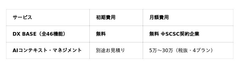 DX BASEは、月額29,800円(税抜)相当の全46機能を、SCSCサービスラインアップをご契約のすべてのお客様に初期費用・月額費用ともに無償で提供いたします。SCSCの最低月額プランは2,000円(税抜)から。つまり月額2,000円で「プロが設計する企業ホームページ(表のメディア)」に加え、「AI搭載の社内DXプラットフォーム(裏のメディア)」「ブラウザセキュリティ診断」「全社ナレッジDB」が手に入ります。「表と裏、両方のメディアを月額2,000円から」──この価格で企業のDX化・AX化を包括的に実現できるサービスは、日本に他にありません。
