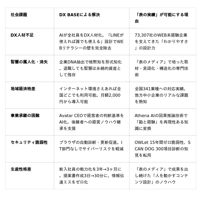DX BASEの社会的意義は「新しいDXツールが生まれた」という次元にとどまりません。15年間・73,307社の「表のメディア」で鍛え上げた知見・技術・信頼を、そのまま中小企業の「内側」に注ぎ込む──この構造こそが、他のどのDXサービスにも存在しない、ガーディアン固有の社会的価値なのです。