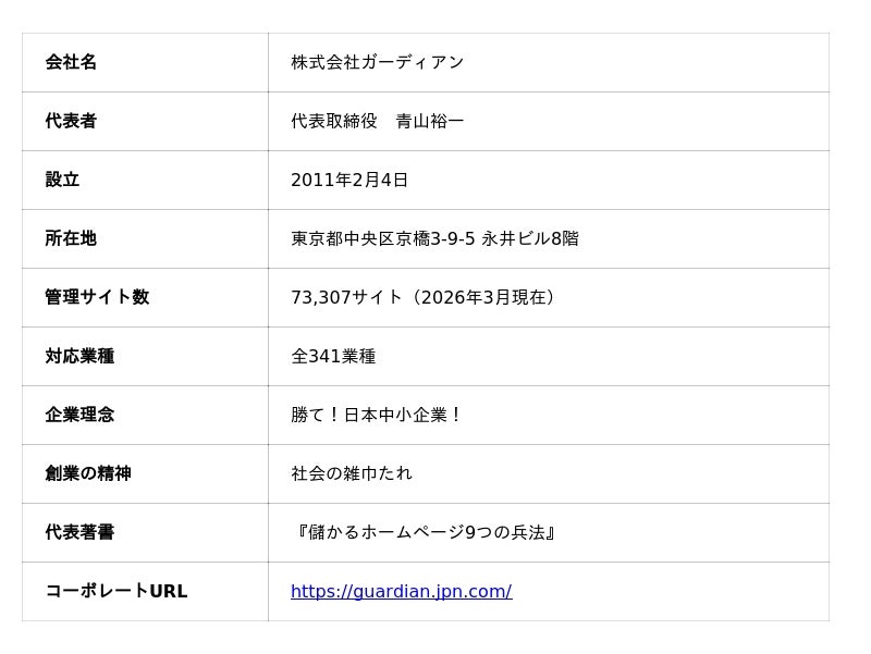 ガーディアンは、「勝て!日本中小企業!」を企業理念に、「社会の雑巾たれ」を創業の精神に掲げ、2011年の創業以来、全国の中小企業のWEB戦略を守り続けてきたWEB総合企業です。代表・青山裕一が提唱する独自メソッド「3D-CMF理論」を基盤に、WEB戦略のサブスクリプション型サービス「SCSC」シリーズを341業種に展開。独自CMS「OWLet」、因果推論AI「Athena」(141億パターン)、セキュリティ診断「SCAN DOG」(300項目)など、業界唯一のテクノロジー群を自社開発・運用しています。
