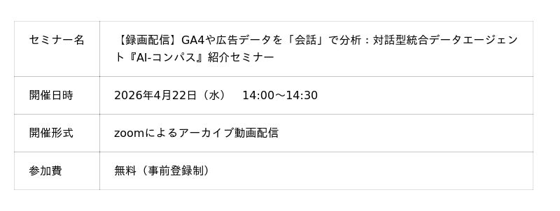 【4/22(水) 無料セミナー】 GA4や広告データを「会話」で分析:対話型統合データエージェント『AI-コンパス』紹介セミナーを再開催