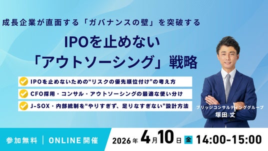 公認会計士人材の知見・経験を活用した経営支援サービスを展開するブリッジコンサルティンググループ株式会社(所在地:東京都港区、代表者:宮崎良一)は、2026年4月15日(水)に、「成長企業が直面する『ガバナンスの壁』を突破する ~IPOを止めない『アウトソーシング』戦略~」をテーマとした無料オンラインセミナーを開催します。