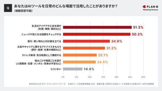 AIツールをどんな日常シーンで活用しているかを尋ねたところ、最も多かったのは「生活のアイデアや工夫を探す(料理・掃除・節約など)」(51.3%)、次いで「ニュースや気になる話題をチェックする」(50.3%)、「旅行・買い物などの計画を立てる」(34.9%)でした。