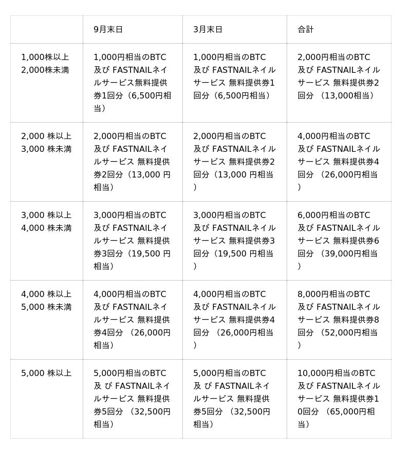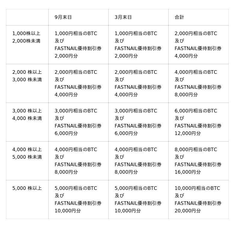 - 5,000株以上:無料提供券 年間10回分(65,000円相当)+BTC
