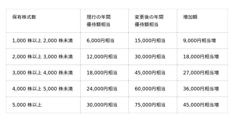 特に、1,000株以上保有の場合、年間優待額は6,000円相当 → 15,000円相当(+9,000円)へと拡充されます。また、最大では年間75,000円相当の優待が提供される制度となります。