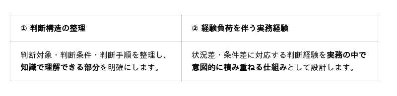 本講習では、熟練者に集中している判断を構造として整理し、個人依存の判断を「組織で再現可能な判断処理能力へ転換する方法」を体系的に学ぶことができます。
