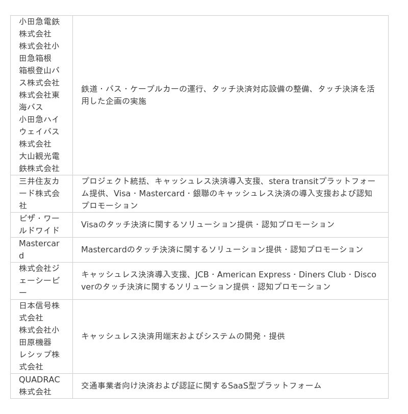 小田急電鉄株式会社、株式会社小田急箱根、箱根登山バス株式会社、株式会社東海バス、小田急ハイウェイバス株式会社、大山観光電鉄株式会社、三井住友カード株式会社、ビザ・ワールドワイド・ジャパン株式会社、Mastercard、株式会社ジェーシービー、日本信号株式会社、QUADRAC株式会社、株式会社小田原機器とレシップ株式会社は、2025年秋以降、小田急線をはじめとした小田急グループの鉄道やバス等で、クレジットカード等のタッチ決済(※1)で乗車可能となる乗り物を拡大します。対象となるのは、小田急線・箱根登山電車・箱根登山ケーブルカー・箱根登山バス・大山ケーブルカーと、東海バス・小田急ハイウェイバスの一部路線です。