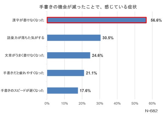 近年、スマートフォンの長時間利用による記憶力や集中力の低下を指す“スマホ認知症”が現代人の新たな課題として注目されています。今回の調査では、スマホの使いすぎが自分の生活や健康に影響していると感じる人が63.2%に上ることが判明しました。さらに、デジタル化の進展により、手書きの機会が減ったと感じる人は68.2%に達し、そのうち「漢字が書けなくなった」と回答した人は56.6%と、半数以上が"書く力の衰え"を自覚する結果となりました。