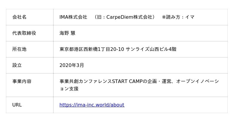 IMA株式会社(代表取締役:海野 慧、以下IMA)は、事業共創カンファレンス「START CAMP 2026 in SHIZUOKA」を、2026年7月23日(木)~24日(金)に静岡県静岡市にて開催することを決定し、共創パートナー及び参加者の募集を開始しました。尚、2026年4月末までに参加企業としてお申込みいただいた場合、早割価格が適用されます。