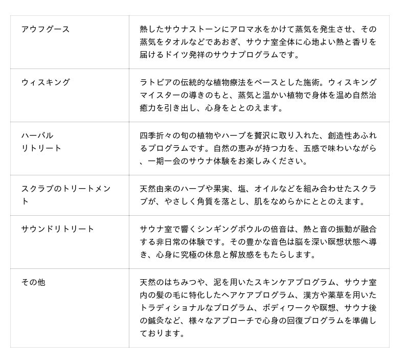 サウナ室では、アウフグースやウィスキングをはじめ、植物の心地よさに包まれるハーバルリトリート、生演奏による音に特化したサウンドリトリート、スクラブのトリートメントなど、独自に開発したサウナプログラムを行います。