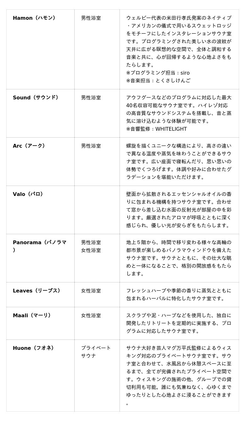 浴室には、男性5室・女性3室のサウナ室をはじめ、男女ともに2種類の水風呂と、湯船を完備。ウィスキングやグループでの貸切などに対応したプライベートサウナも備えています。