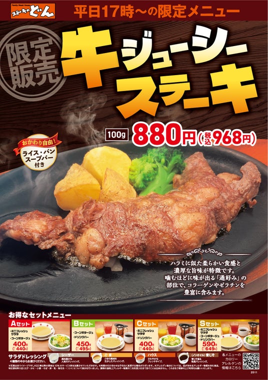 『ステーキのどん』平日17時以降の限定メニュー『牛ジューシーステーキ』を驚きの880円(税込968円)で販売開始!