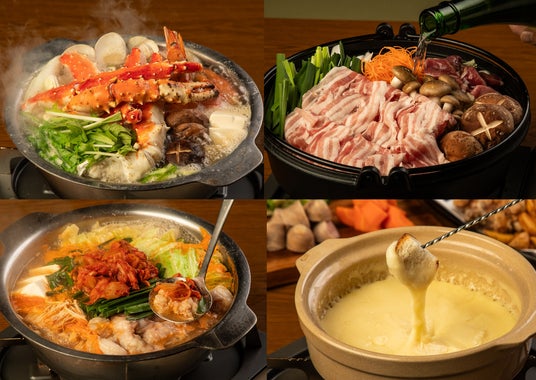今年は、趣の異なる4種類の新作鍋がラインナップ。贅沢な海の幸を堪能できる「豪華タラバ蟹鍋」、日本酒だけで煮込む香り高い「無水美酒鍋」、旨辛スープが食欲をそそる「国産もつチゲ鍋」、そして、夜のご褒美にぴったりな「背徳チーズフォンデュ鍋」が新たに登場いたしました。