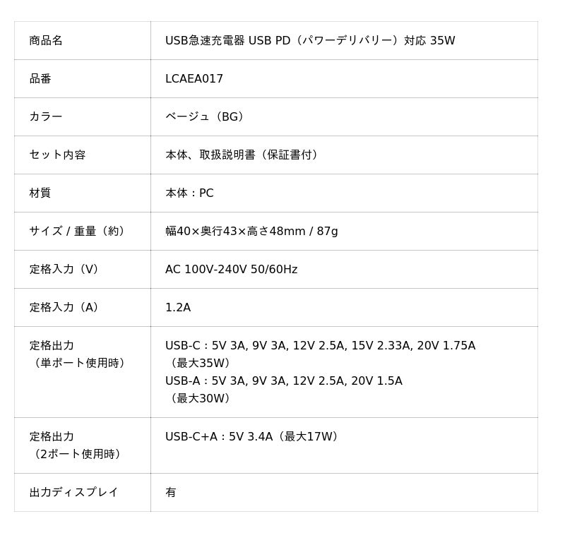 「USB急速充電器 USB PD(パワーデリバリー)対応 35W」LCAEA017