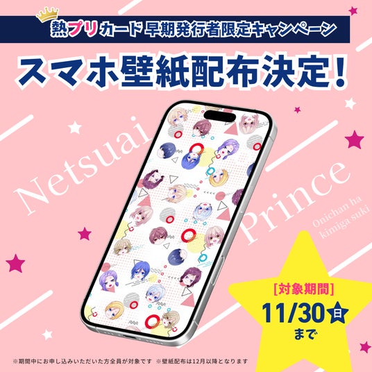 早期発行者限定キャンペーン熱愛プリンスカードをお申し込みいただいた方全員にもれなく限定デザインの《スマホ壁紙》をプレゼントいたします。【対象期間】2025年11月7日(金)~11月30日(日)