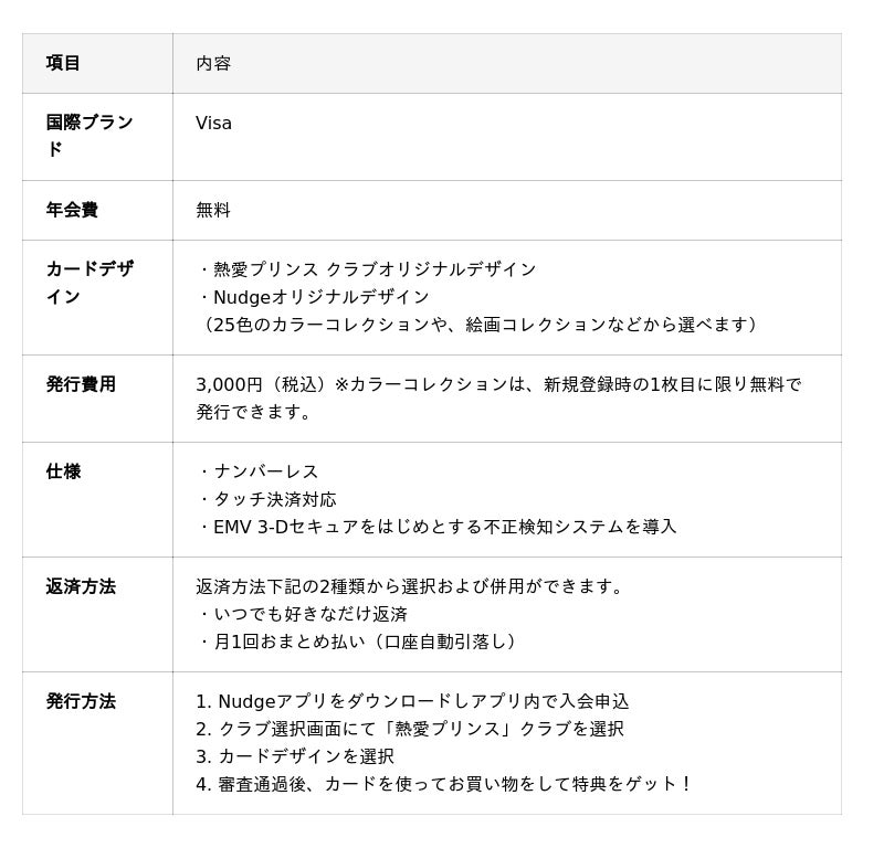 ナッジカードアプリから「熱愛プリンス」クラブに入会の上、本カードをご利用いただくと、累計利用額利用金額に応じて、本カードでしか手に入らない特別な特典を提供いたします。【限定特典の例(一部抜粋)】