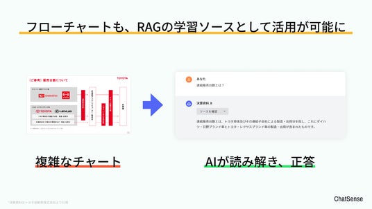 従来のRAGサービスでは、ファイル内の画像を学習させることはできません。しかし、ChatSenseでは独自の技術により、PDF・Word・PowerPoint 等のファイルに含まれる画像やチャートデータについても学習可能です。
