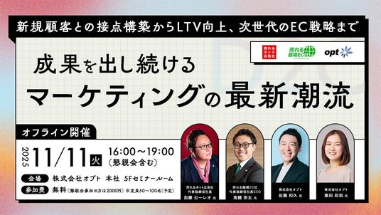 売れるネット広告社株式会社(本社:福岡県福岡市、代表取締役社長CEO:加藤公一レオ、東証グロース市場グループ会社(売れるネット広告社グループ株式会社:証券コード9235)、以下 売れるネット広告社)は、2025年11月11日(火)に、『新規顧客との接点構築からLTV向上、次世代のEC戦略まで。成果を出し続けるマーケティングの最新潮流』セミナーを開催いたします。