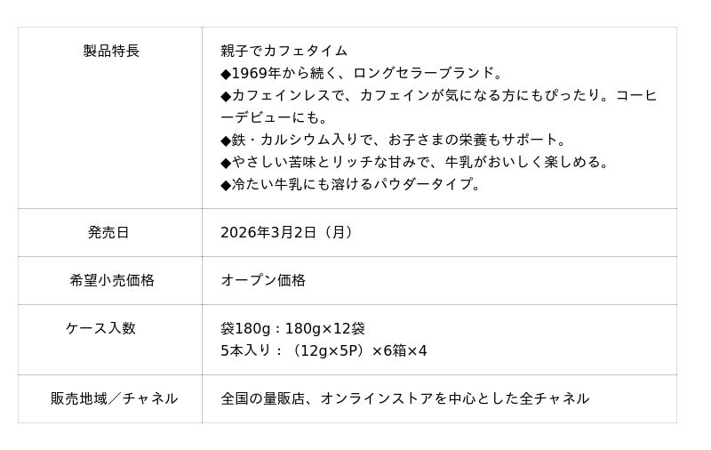 この度、親子で一緒に「カフェタイム」を楽しめるカフェインレスコーヒーの新たなラインアップとして、牛乳で溶かして飲むパウダータイプが新登場します。カフェインレスコーヒーを使用しているほか、成長期のお子さまに嬉しい「鉄・カルシウム」を配合しており、“コーヒーデビュー”にも最適です。冷たい牛乳にも溶けるため、忙しい朝やリラックスタイムのアイスドリンクとしても手軽にお使いいただけます。
