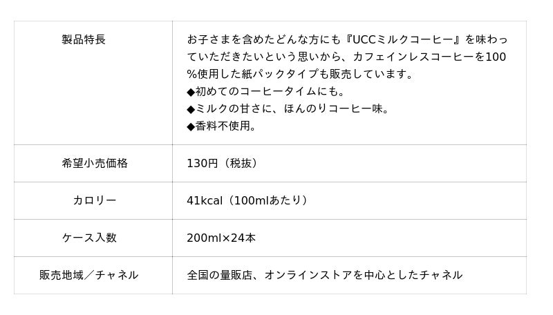 『UCCミルクコーヒー』は、1969年にUCCグループ創業者・上島忠雄(1910~1993)の「いつでも、どこでも、一人でも多くの人においしいコーヒーを届けたい」という創業精神のもとに開発された、世界初の缶コーヒーです。「初めて飲んだコーヒーは『UCCミルクコーヒー』」という、“コーヒーデビュー”アイテムとしてのエピソードはお客さまからよくお寄せいただいています。より幅広い世代の方に『UCCミルクコーヒー』を味わっていただきたいという思いから、お子さまにも安心してお召し上がりいただけるカフェインレスコーヒーの紙パックタイプを2019年より展開しています。