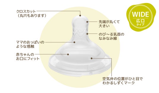 広口タイプは洗いやすく、さらに調乳がしやすく、咥えた時の触感がママのおっぱいにより近い哺乳びん。ぽっちゃりしたカタチで安定感があり倒れにくいため、調乳や授乳中も快適に使用することができます。