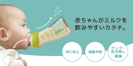 ドクターベッタ哺乳びんは、赤ちゃんがミルクを飲みやすいカタチ。小児科医が考案した独特の「カーブ」で母乳授乳と同じ上体を起こした自然な姿勢でミルクが飲めます。