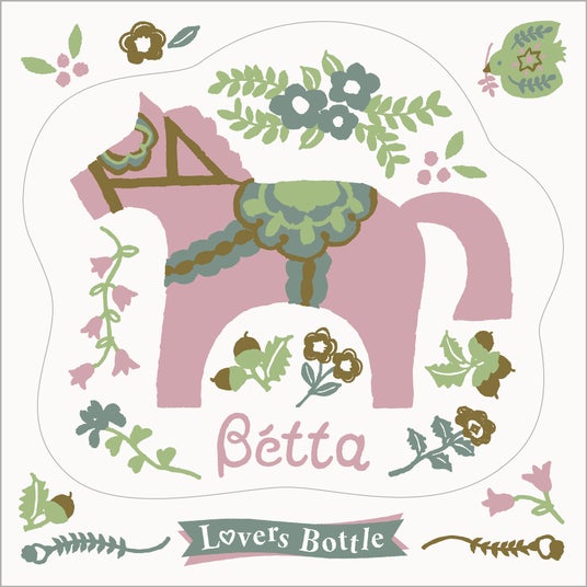 北欧調の優しいタッチで描かれた男の子と女の子の馬が、牧歌的な世界観を表現。オリーブの枝をくわえた鳩が平和の象徴として添えられ、赤ちゃんの健やかな成長とご家庭の穏やかな日々を願う想いを込めました。