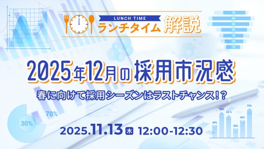 タイトル:ランチタイム解説 2025年12月の採用市況感 春に向けて採用シーズンはラストチャンス!?開催日時:2025年11月13日(木) 12:00 ~ 12:30 ※10分前から入室可能