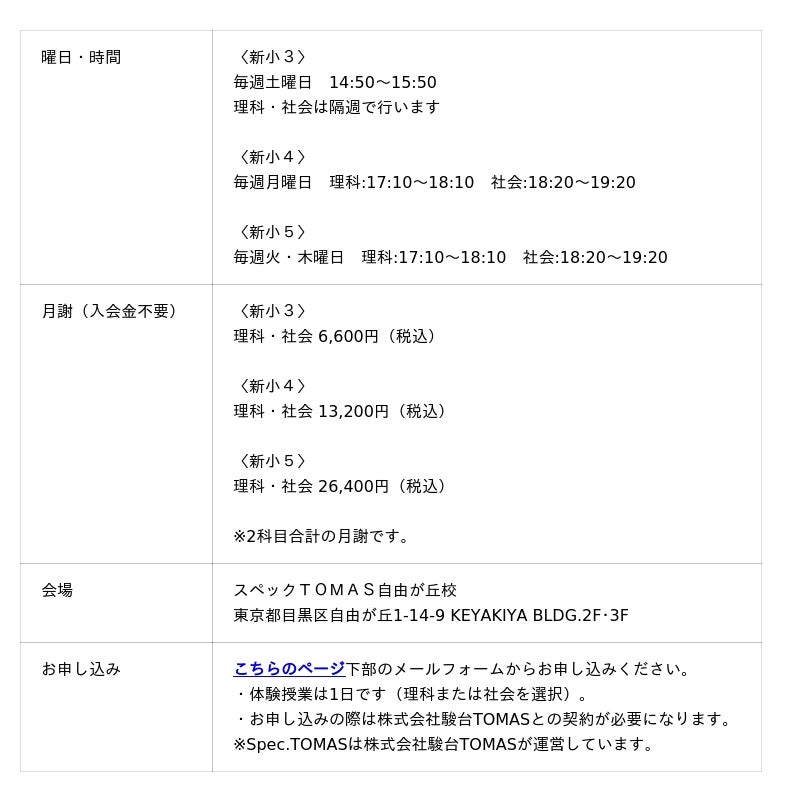 株式会社リソー教育グループ(本社:東京都豊島区、代表取締役:天坊真彦)の子会社である、株式会社駿台TOMAS(本社:東京都豊島区、代表取締役:町田仁)は、最難関中学受験専門個別指導塾「スペックTOMAS」にて、新小3~新小5を対象に「理社グループ授業」を開講いたします。