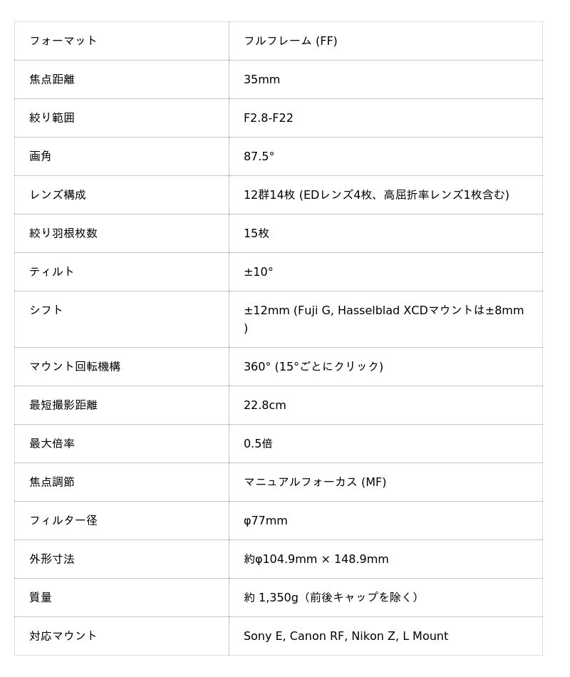 本レンズは、広角域のパースペクティブ制御が可能なティルト・シフト機能と、被写体に肉薄できる0.5倍マクロ機能を融合させた革新的なレンズです。建築、風景、商品撮影からファインアートまで、プロフェッショナルの要求に応える高い光学性能と操作性を備えています。また、余裕あるイメージサークルを活かし、ラージフォーマットカメラ(G/XCDマウント)への対応も実現しています。