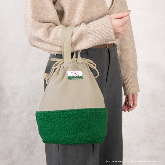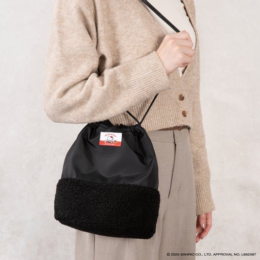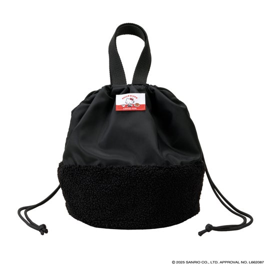 ・ハローキティのタグが映える、異素材ミックスのボア巾着バッグ